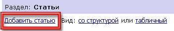 Перейти в режим добавления статьи можно кликнув на ссылку добавить статью в разделе Статьи.