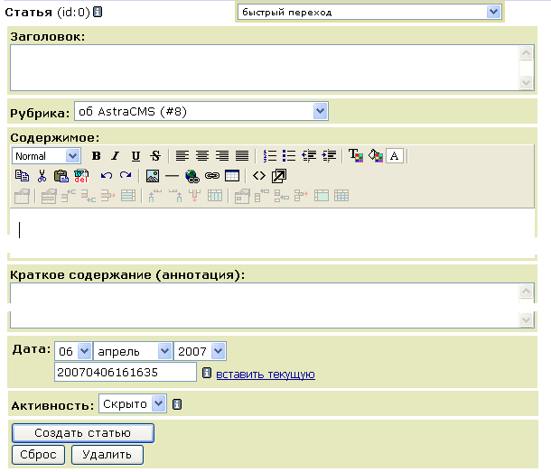 Заголовок статьи - обязательное поле, в котором обычно указывается название документа. Рубрика - статья должна быть обязательно относиться к конкретной рубрике в текущей структуре сайта. Содержимое - основное содержимое документа. Текст, графика и т.д. Краткое содержание (аннотация) - краткое содержание документа. Часто используется для оформления новостей или списка статей. Необязательное поле. (Назначение иногда переназначается для конкретной задачи клиента. Более точную информацию Вы можете получить у разработчика Вашего сайта) Дата - дата создания или публикации, или изменения документа. Используется в новостных лентах. Активность - определяет будет ли публиковаться документ или будет ли он виден только администраторам сайта, т.е. скрыт. Используется для временного скрытия документов и подготовке их к публикации.