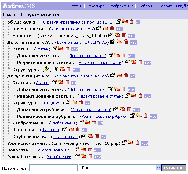 Раздел Структура позволяет контролировать и управлять всей иерархией документов и навигации на Вашем сайте. Рубрика - это элемент структуры, на базе которого строится навигационная часть сайта и который однозначно определяет принадлежность любого документа конкретному месту в структуре. Любой документ должен принадлежать лишь одной определенной рубрике, но это не значит, что нескольким рубрикам нельзя поставить в соответствие в навигации один и тот же документ. В системе нет ограничений на количество рубрик и на уровень их вложенности.