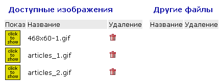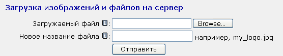 Для оформления Ваших документов можно использовать изображения. Для работы с ними (загрузка и удаление) служит раздел Изображения. Кроме самих нрафических элементов и фотографий в этот раздел также можно помещать другие файлы. Например, Ваш прайс-лист в формате MS Excel и др. Вверху Вы видите форму для загрузки изображений и файлов на сервер. Укажите файл, который следует загрузить на сервер.
